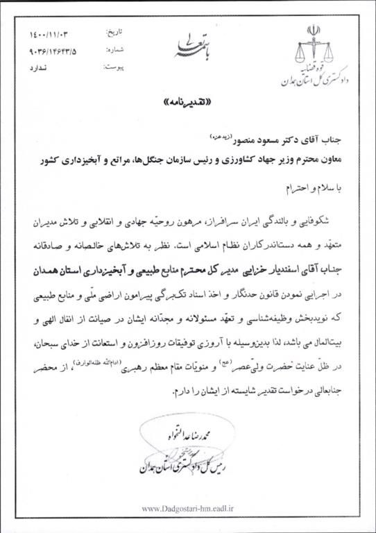 رييس کل دادگستري استان همدان ازوظیفه شناسی،تعهد مسولانه ومجدانه مدیرکل وهمکاران پر تلاش منابع طبیعی استان در اجرائی نمودن قانون حدنگاری واخذ اسناد تک برگی اراضی ملی و حفظ وصیانت ازانفال وبیت المال را ستودنی وقابل تقدیر عنوان کرد.