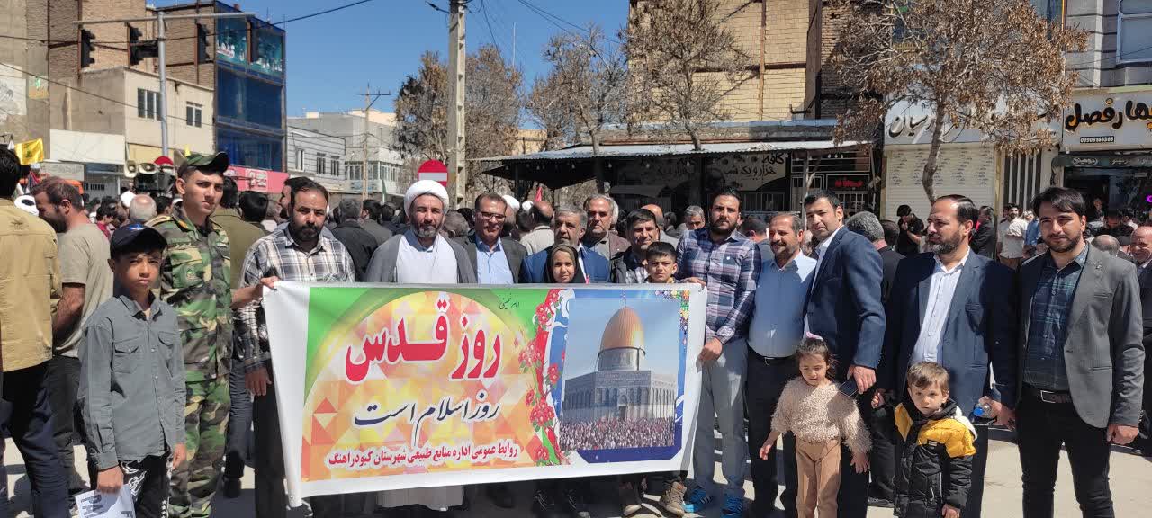 به گزارش روابط عمومی اداره کل منابع طبیعی و آبخیزداری استان همدان در آخرین جمعه ماه مبارک رمضان و روز جهانی قدس، کارکنان اداره کل منابع طبیعی و آبخیزداری استان همدان با شعار « به یادهر شهید غزه ،نهال می کاریم »در تمام شهرستان ها و همگام و همدل با سایر اقشار جامعه در راهپیمایی روز قدس شرکت کرده و فریاد آزادی قدس شریف و انزجار از رژیم غاصب صهیونیستی را فریاد زدند.